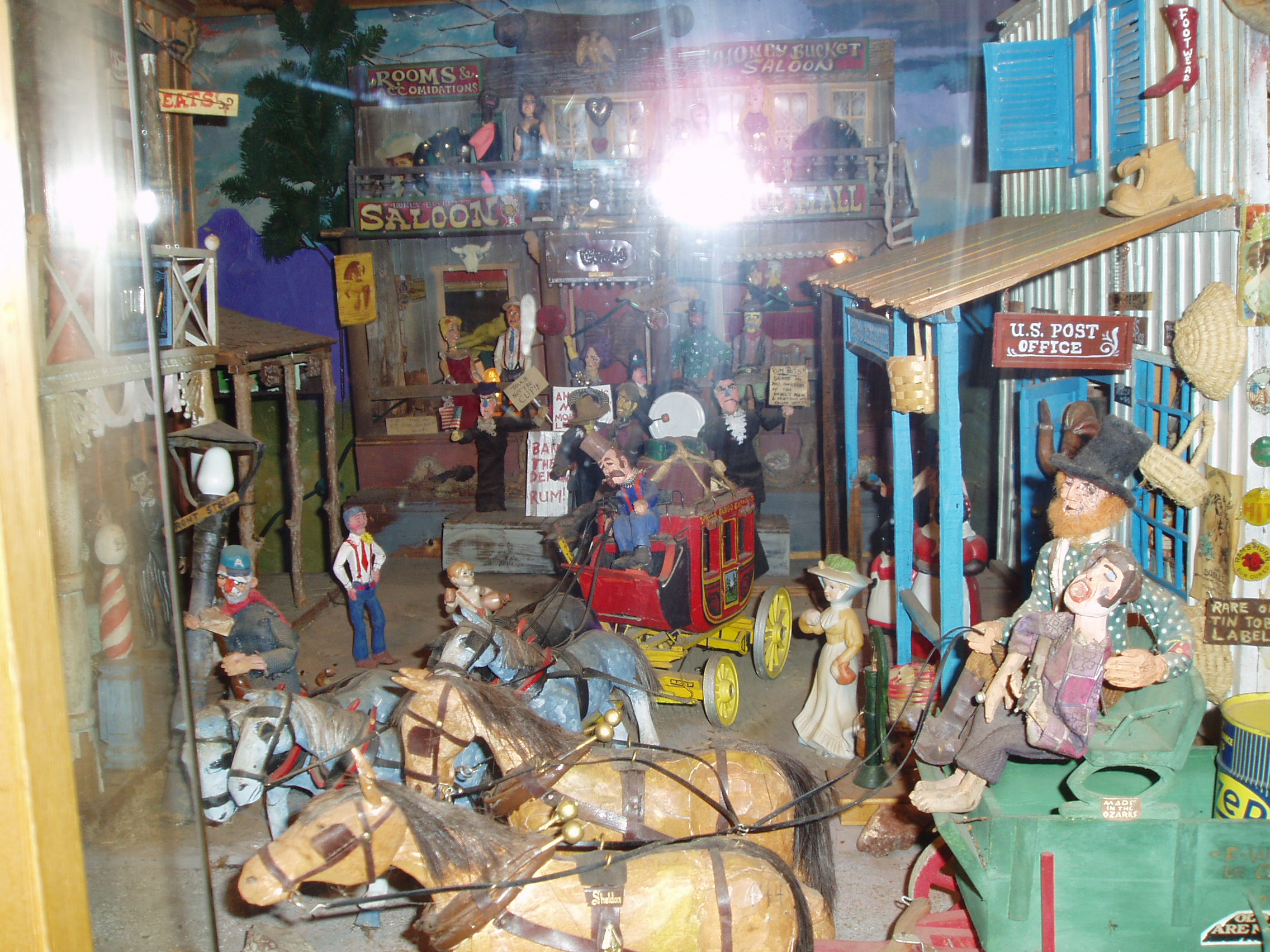 scenes of miniatures Ross Ward crafted during the too-short five decades of his life, the multi-room and meandering building is an overwhelming visual experience. A cacophony of sights. Crusty musicians greet you. Stick a quarter in the slot and they sing, strum the guitar. Here is a model of a town in the Old West complete with the Chinese laundry, brothel, saloon and so much more. Push this button and a miniature chef with raised cleaver chases an unfortunate chicken, bar doors open and close, the blacksmith bangs on a horseshoe. Go to the circus scene with its hundreds upon hundreds of characters. Push this button and a dog jumps endlessly through a hoop, tigers rear and raise their paws, a trapeze performer swings.