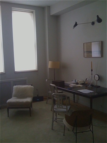 The other chairs in this shot (you may have realized by now that I'm a chair fetishist) are a slipper chair by TH Robsjohn-Gibbings in the background, and a Danish chair which I adore, but for which I can never remember the designer's name. The Gibbings chair took forever to find, wasn't a bargain on eBay, shipping was a fortune, refinishing and reupholstery cost an arm and a leg, and then, when I finally set it out in my living room for the first time, the second my back was turned, my cats tore into it, unable to resist the nubby fabric. Literally, the thing was shredded within 10 minutes of my leaving the room. Which is why it usually is covered with a sheepskin.
