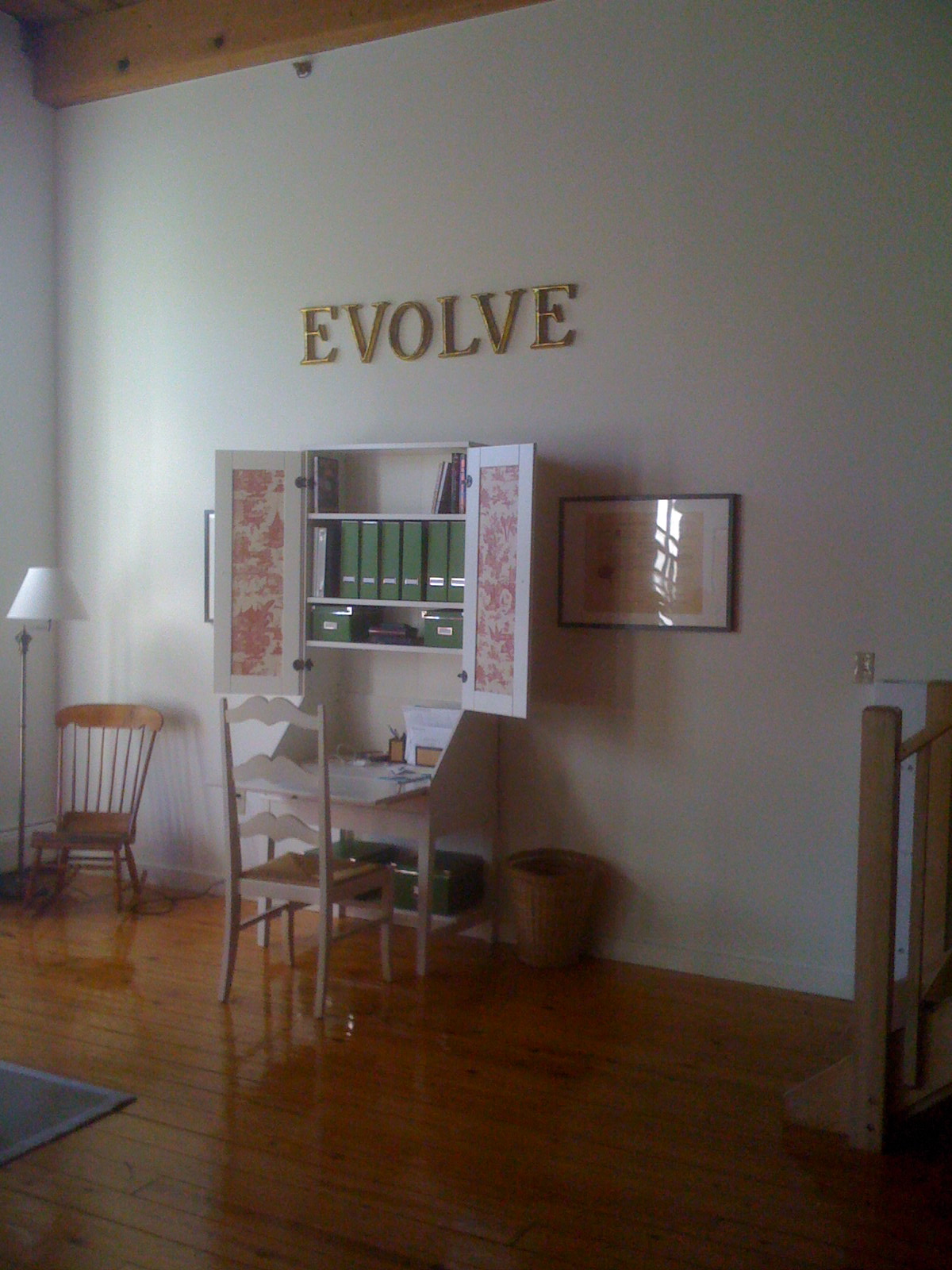 The desk is from IKEA, but the toile wallpaper I bought online. My daughter and I went to a garage sale last summer and they had two sets of large gold letters spelling “LOVE” for sale, for $4 each. I said, “hey, if we buy both of them, we can spell ‘EVOLVE’!” So we did.