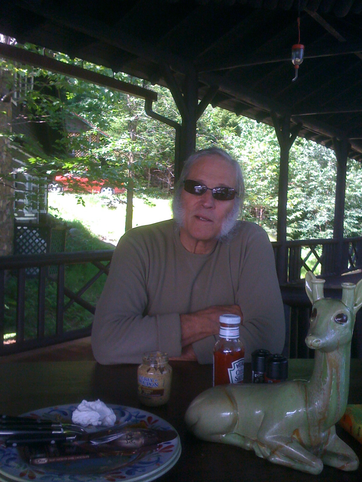 Here’s Dad, sitting on the porch outside the dining room last summer. We all thought that ceramic deer should’ve been thrown into the lake sometime in the Mid-Fifties. It’s fucking fugly.