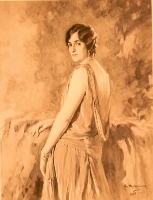 [Tougher to see in this sepia repro. That’s actually an emerald-and-diamond bar pin in the hanging sash of her dress, directly below her left wrist.]