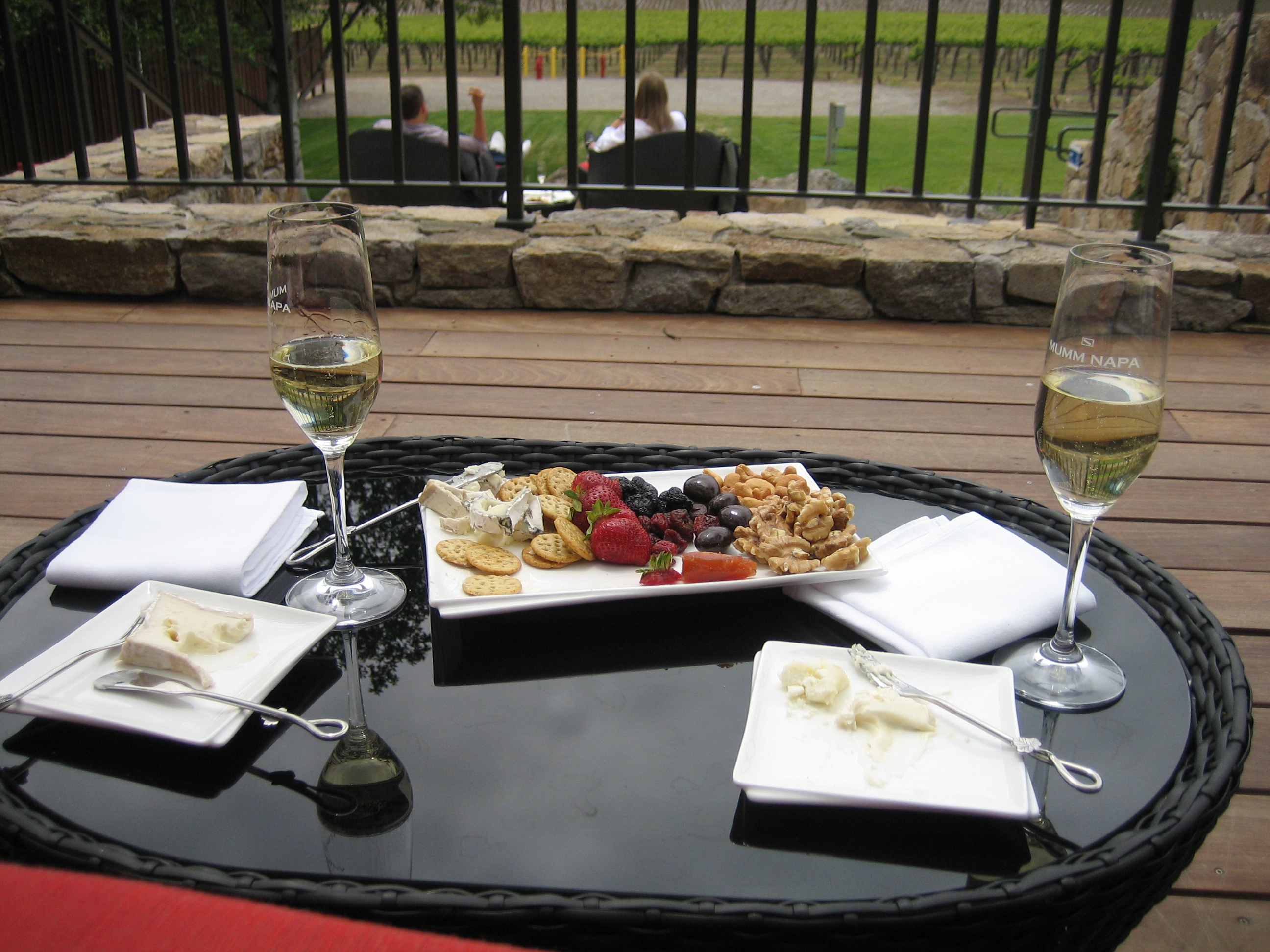 We started with a drive up the 128 to Mumm Napa. What better way to start an unbirthday than with champagne? (And yes, I know this is really sparkling wine, real champagne only comes from the French champagne region.) We took a seat on the Oak Terrace, Mumm’s gorgeous new outdoor tasting deck, settling into the comfy red wicker, and were served our tasting flutes. Though since we were on the Oak Terrace, we were tasting from the Library Collection, and the flutes were full : )