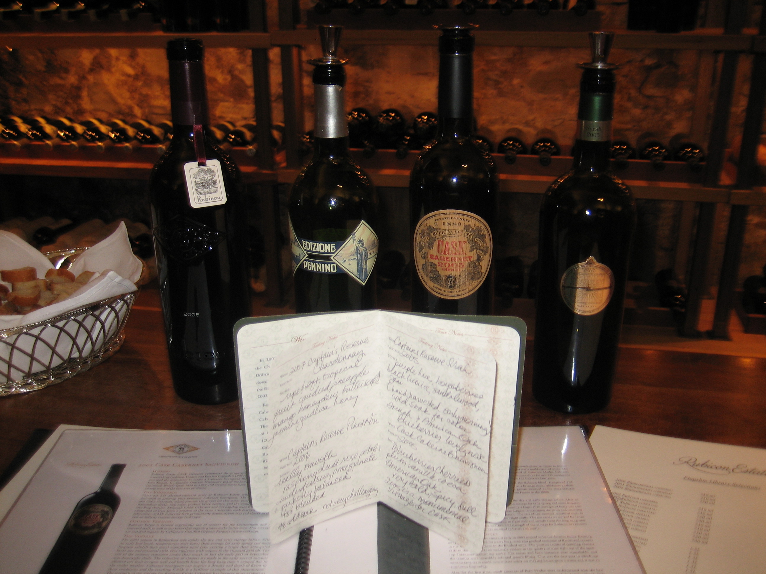 Next was the 2005 Cask Cabernet Sauvignon. This was a monumental vintage for the Cask, and the wine was rich with blueberries, cherries, plum, vanilla and cocoa, and was very bold and spicy. Really excellent wine (we bought some to take home!) We tried the 2005 Rubicon too, a heavy cabernet with loads of pepper, raspberry and smoky wood notes. Just fantastic.