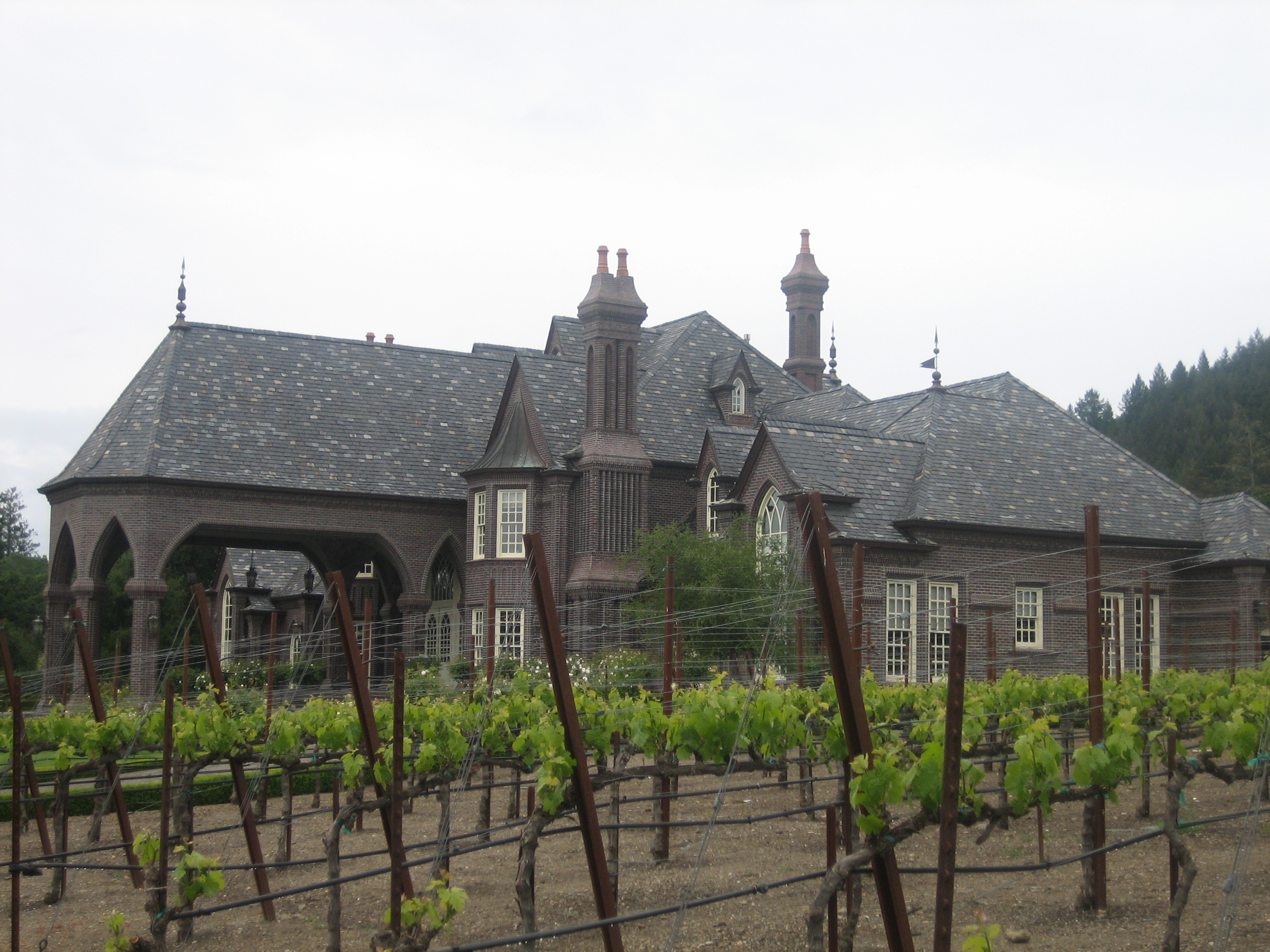 The drive was beautiful, though we got caught in the downtown district of Sonoma, which I thought was much more “city” than Napa. But when we cleared out of that, we were able to drive for about thirty minutes, gazing at the vineyards, feeling the slow seep of time. We spied a huge mansion in the distance, and the closer we got, the more interesting it looked. They had a sign that said Sangiovese in the front, so we stopped. (We really need a bumper sticker that says “I Brake for Sangiovese”.)