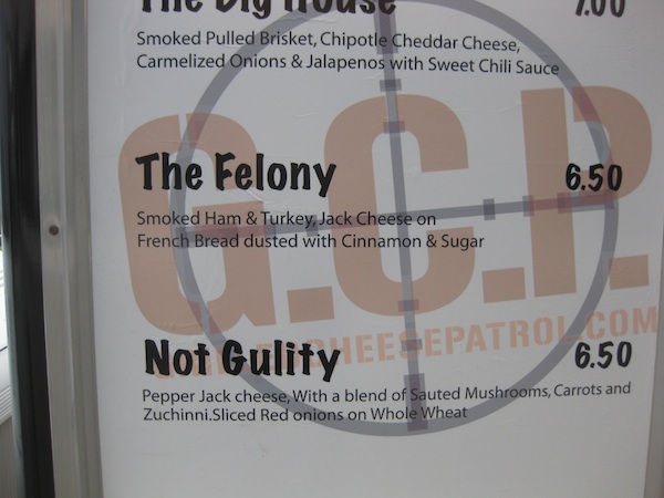 I sacrificed myself on Wednesday, and, in the theme of crime fiction, I had the “Felony” from the Grill Cheese Patrol truck. I meant to take a picture of my food. But I ate it instead. Oops.\