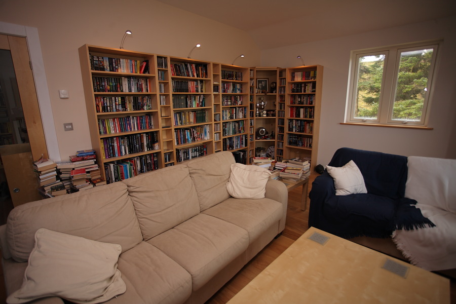 In case you’re wondering where the books are, they’re in the upstairs lounge, next door to the office. I’m in the midst of rearranging them at the moment, which is why there are piles of them on tables, most of which have come off the shelves behind where I’m standing with the camera, and have yet to be put back. The gaps are mostly from the CDs. I’ve been downloading our music collection onto the iPod and have been putting the CDs to one side as I’ve done them. They fill several archive boxes, also out of shot. (Come on, I’m not going to show you ALL my untidiness!)