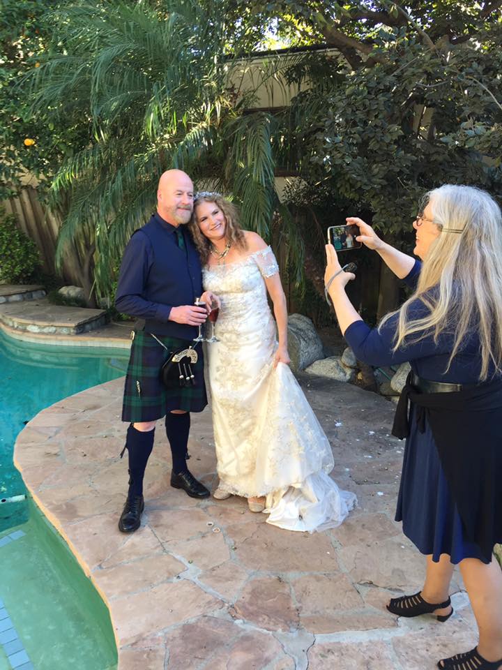 The ceremony was in Los Angeles, a gorgeous and magical production put together at pretty much the speed of light by my closest actor, writer, director, production designer – and Buddhist scholar/minister! – friends whom I’ve known since we performed together in the theater department at Berkeley. We danced down the aisle to Dean Martin, nearly got a reason that we should not be joined that turned into a fantastic performance of my favorite Shakespeare sonnet, murdered a wedding cake – and promised to love till death us do part.