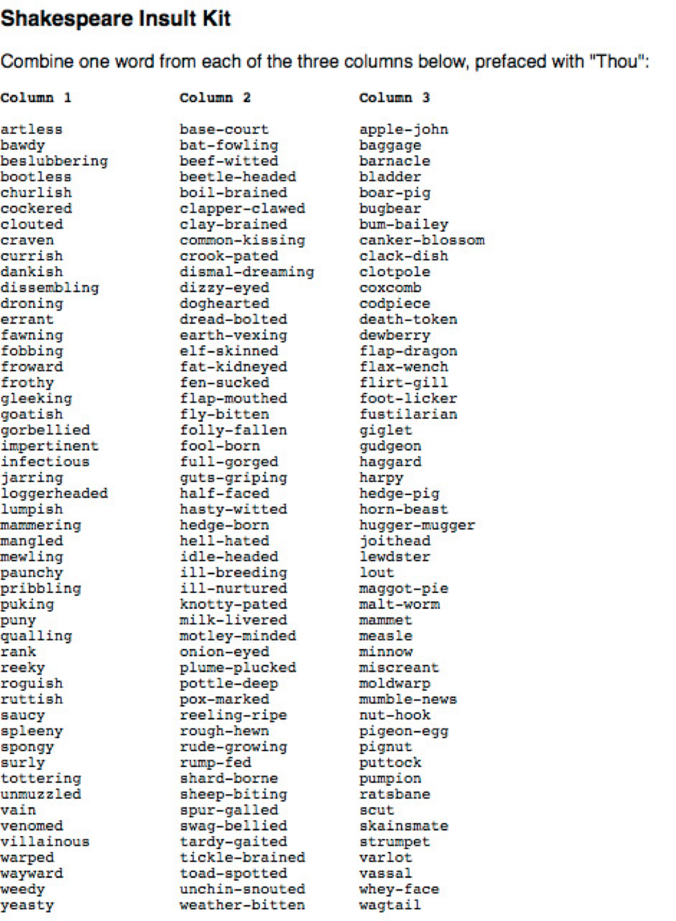 Meanwhile, you can also have some fun turning place names into insults. There's a town near where I used to live which tourists think is pronounced Longs-lee-dale, but the locals pronounce long-sleddl. There's also one pronounced Wet Sleddle. For northern insults you simply have to add, "Eeh," before it instead of "thou", thusly "Eeh, you great wet sleddle."