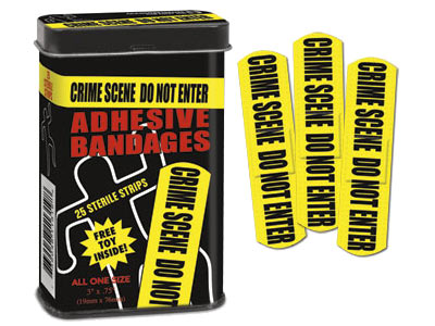 With all those knives around, you know that, ah, accidents could happen. For the big “accidents,” I’d suggest good legal counsel. for the little ones, however, there are the Crime Scene Bandages: