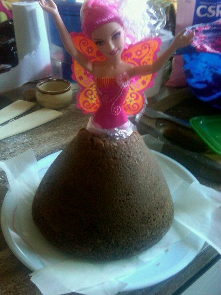 Stage 2: Stick fairy Barbie into the cake (and also line the plate). Note: I’m afraid some of Barbie’s legs had to go. I know…cruelty to dolls is NOT a good sign! But it was off at the knees for this Fairy Barbie.