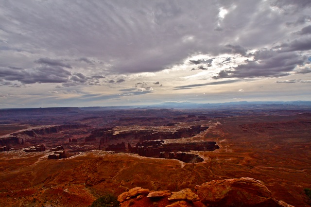(Another area of Canyonlands… what you cannot grasp from this photo is the vastness of the scale here. From where this shot was taken to the bottom of that canyon you see in the center of the photo is a 2000 ft. difference in elevation. There are canyon walls beyond that, levels upon levels, created hardship by hardship, over eons of time. Beautiful, sublime.)