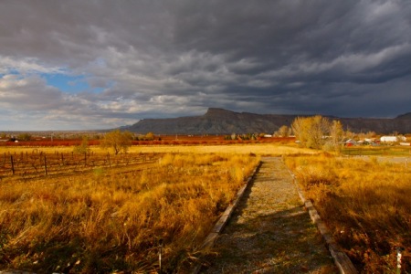 (A shot I took of what seemed to me a most unlikely thing–a vineyard at the base of the mountains in Palisade, CO. A vineyard, in snow country surprised me. But their Reserve Riesling was one of the best I ever tasted. Surprises on the journey.)