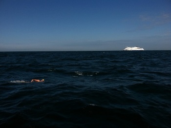 Over the course of the day, we saw and came close to dozens of cargo ships and large ferries. We learned about the various lanes, the separation zone between the lanes and found small celebrations in crossing the lanes, crossing into French waters, over the Channel Tunnel (I had the pleasure of swimming across this) and watching Dover disappear and seeing no coastlines to seeing France begin to appear on the horizon. Our Observer had us charmed with stories of his 23 year-old cat Jessica and rolling with laughter with tales of past swims.