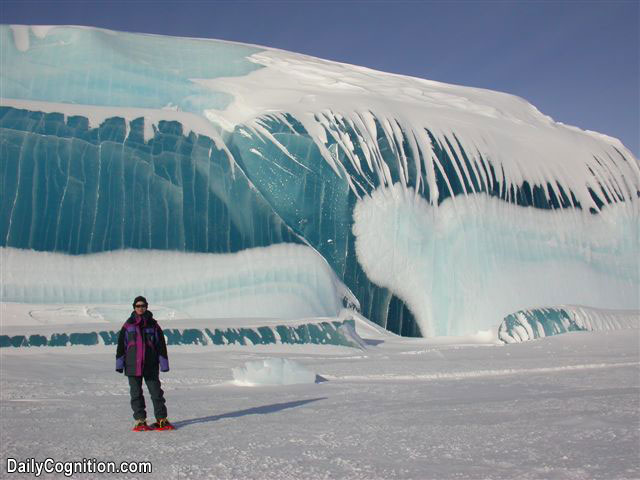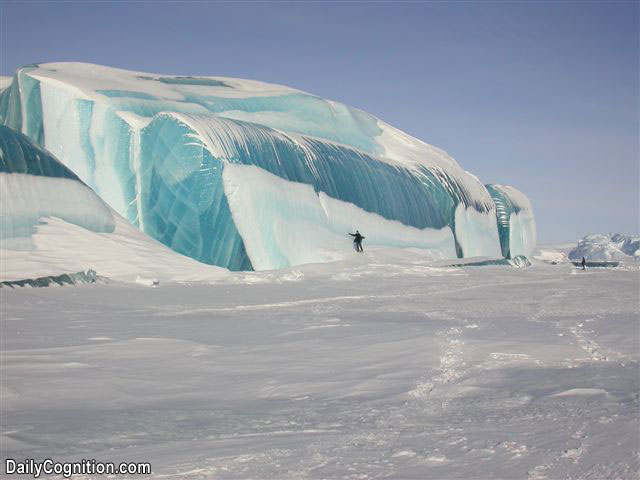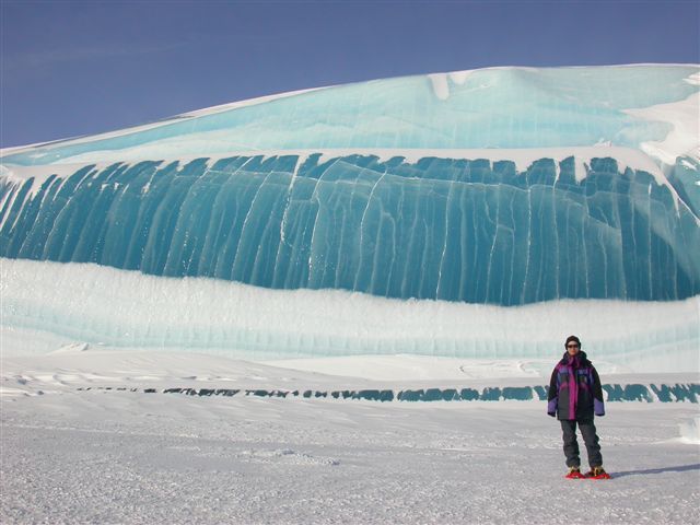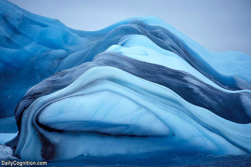 And, just to break things up a bit, I’ve interspersed them with some glorious pictures sent to me this week of the coloured patterns in icebergs, caused by them picking up different pigments, or frozen waves. Icebergs in the Antarctic area sometimes have stripes, formed by layers of snow that react to different conditions. Blue stripes are often created when a crevice in the ice sheet fills up with melt-water and freezes so quickly that no bubbles form. When an iceberg falls into the sea, a layer of salty seawater can freeze to the underside. If this is rich in algae, it can form a green stripe. Brown, black and yellow lines are caused by sediment, picked up when the ice sheet grinds downhill towards the sea.